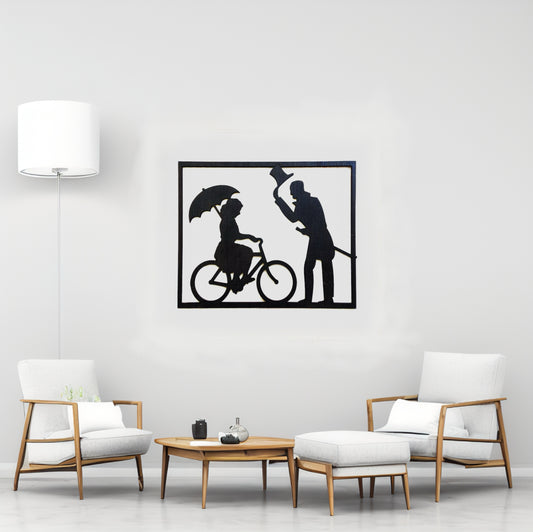 Tableau Femme à Vélo avec Parapluie et Homme Saluant