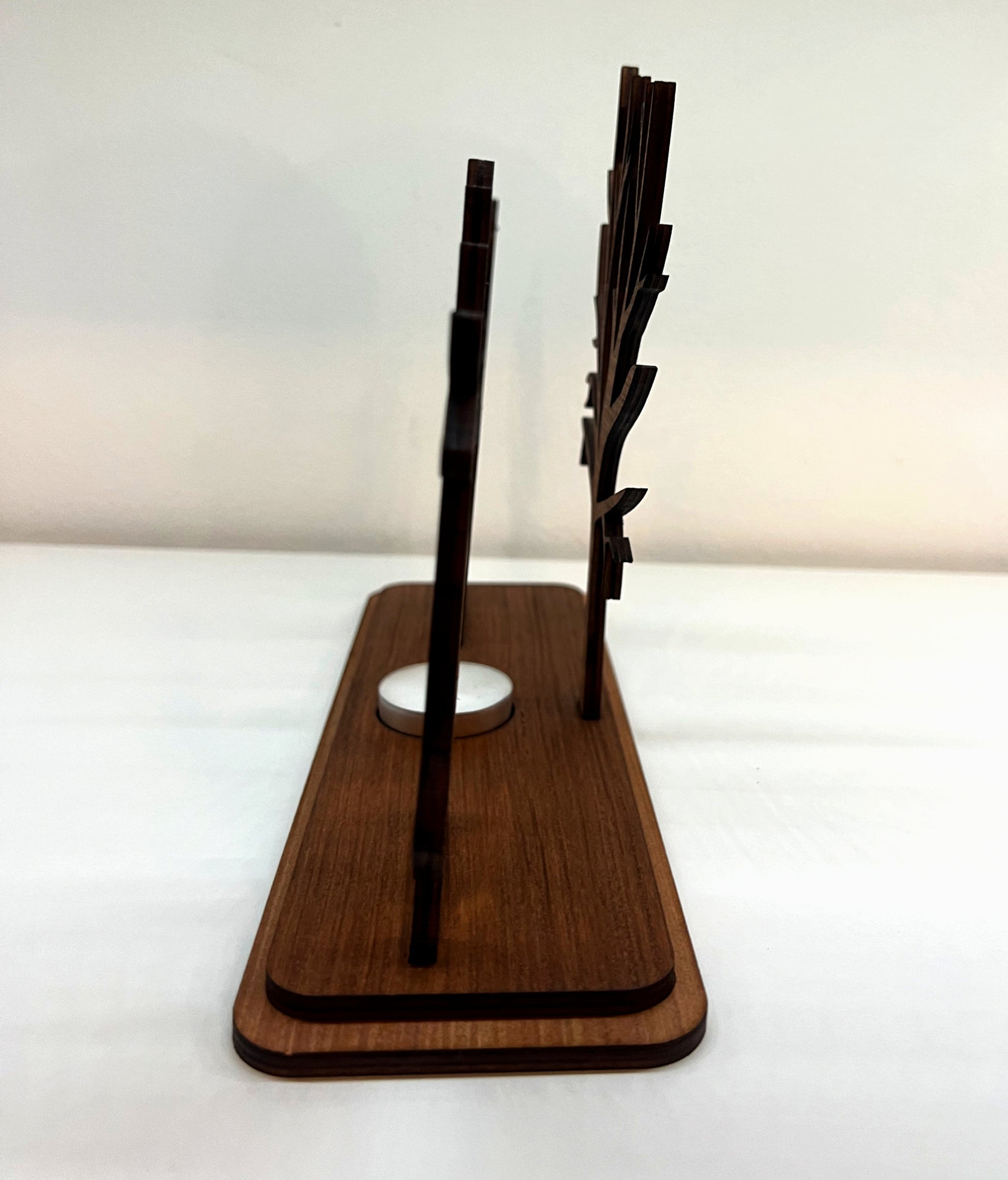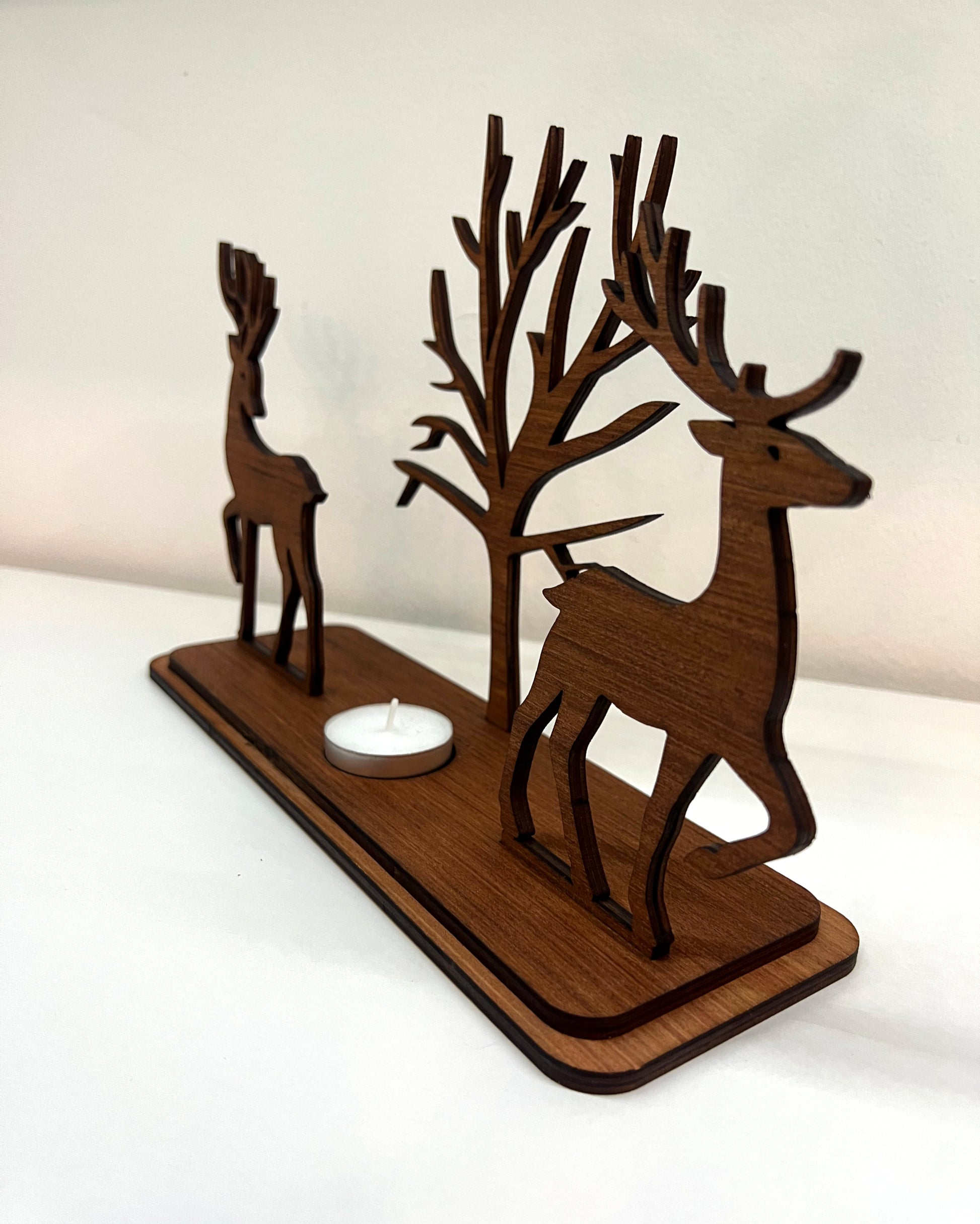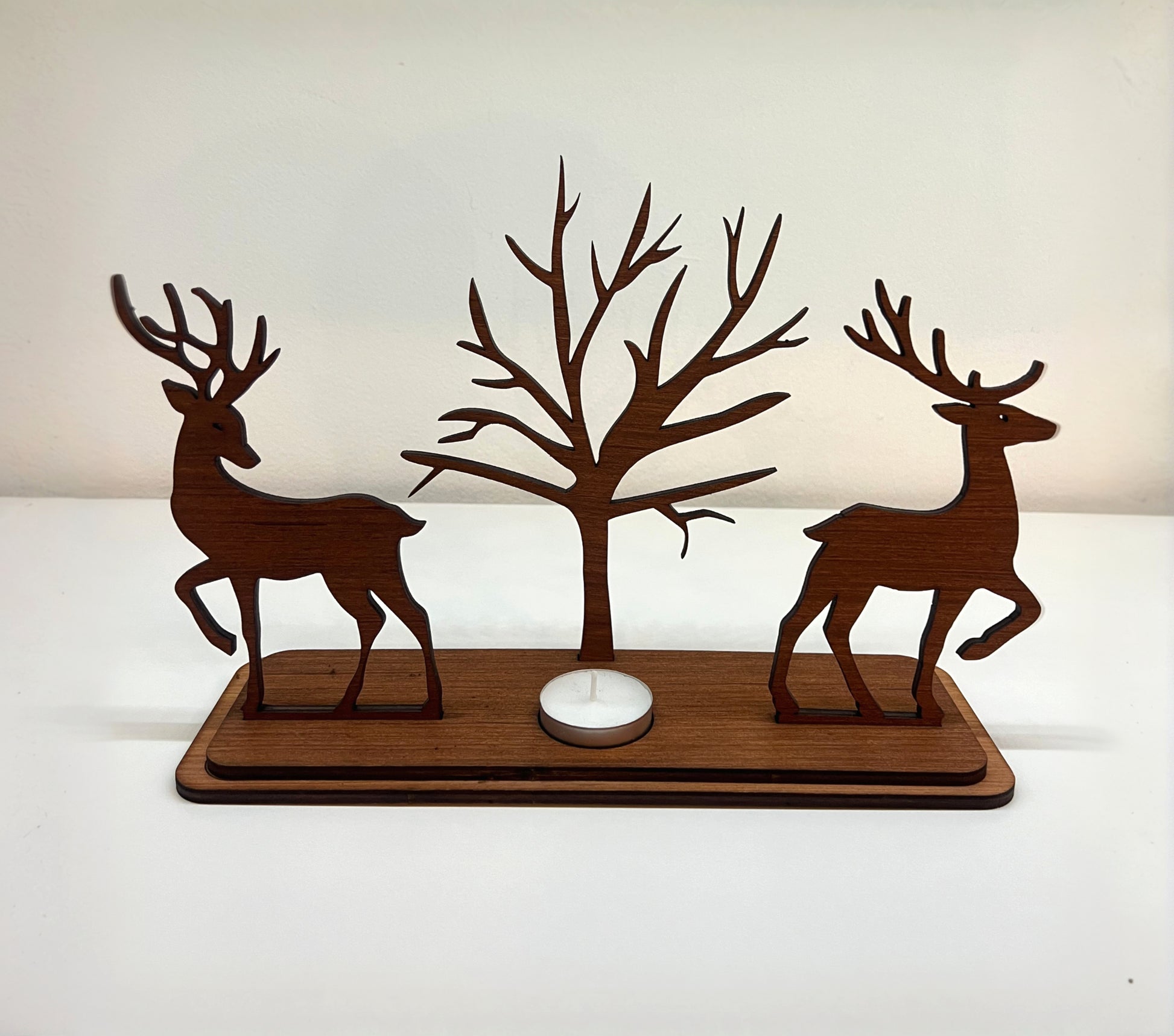 Découvrez notre Bougeoir en Bois avec Motif de Cerfs, une pièce fabriquée à la main dans notre atelier à Carcassonne, en France.