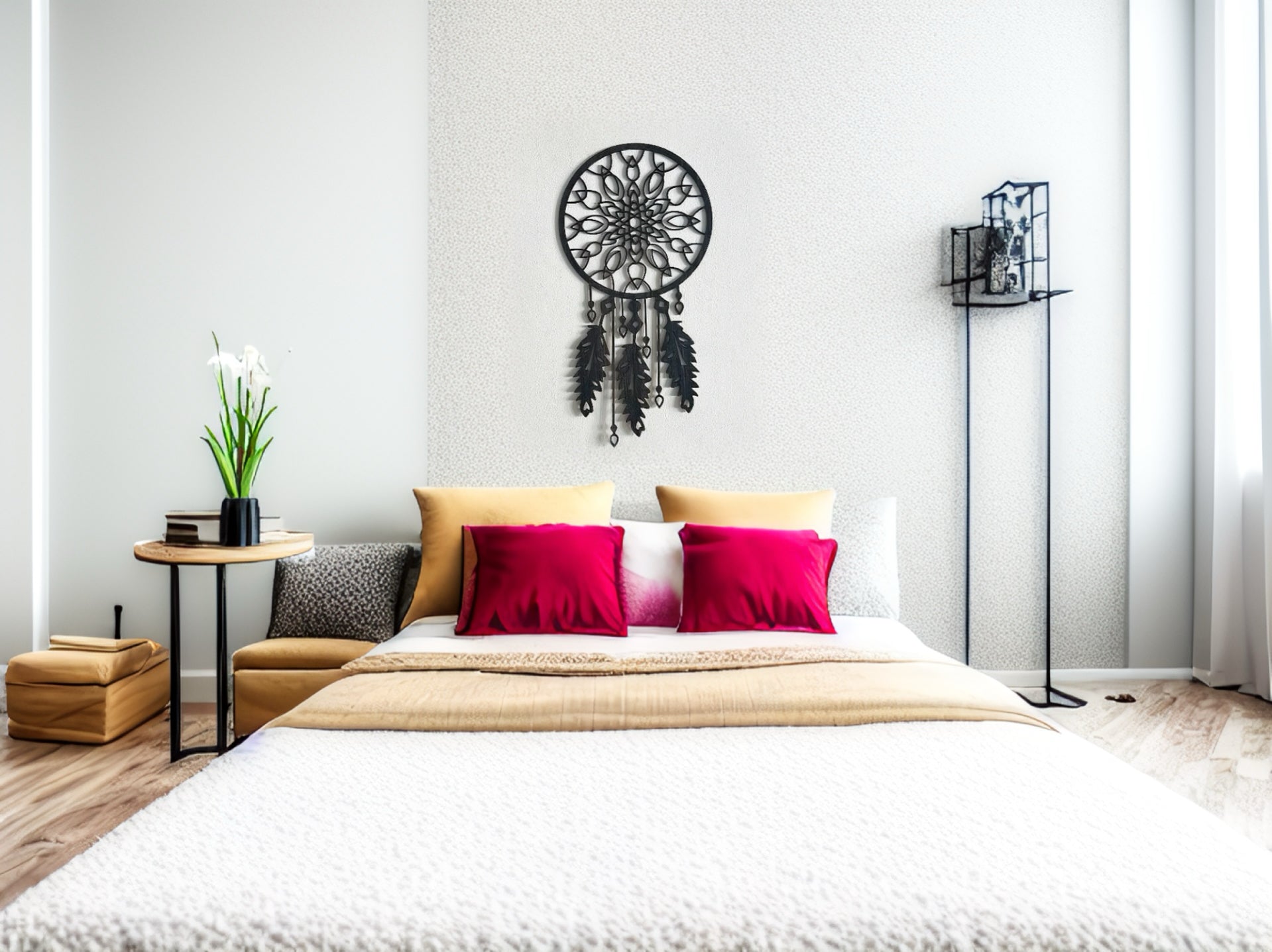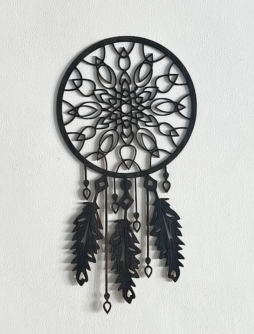 Décoration murale en bois attrape rêves en bois de dimension 46 cm x 24 cm.