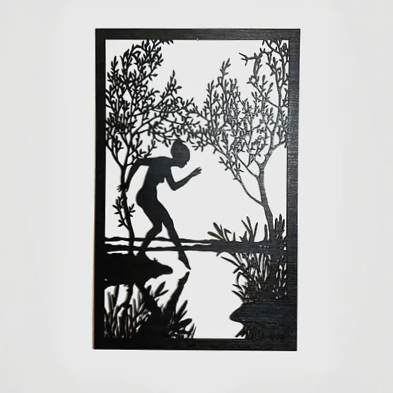 Décoration murale en bois artisanale - Paysage rivière avec silhouette