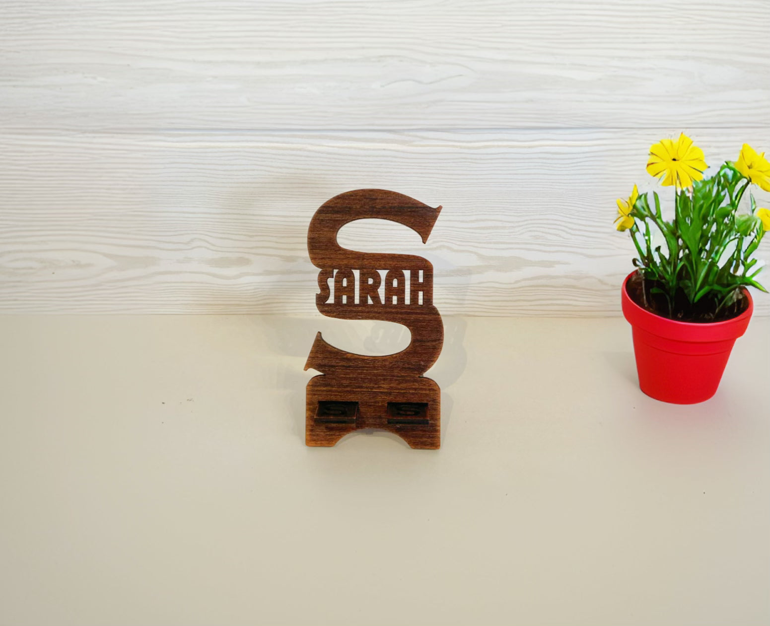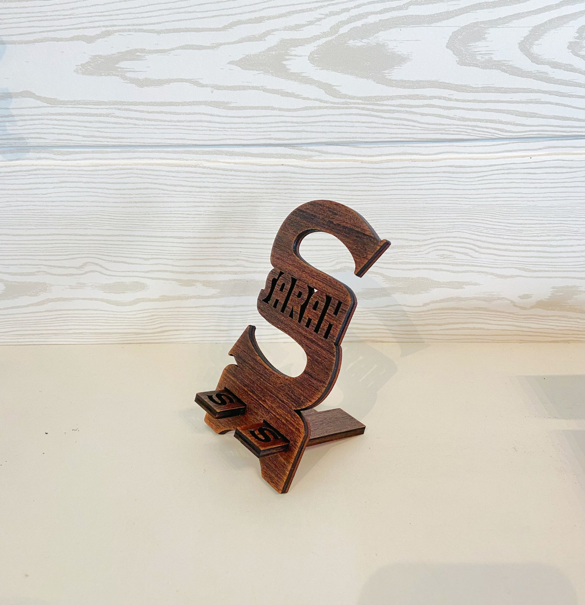 Support téléphone en bois personnalisable avec le nom de votre choix. Un cadeau original, unique et artisanal.
