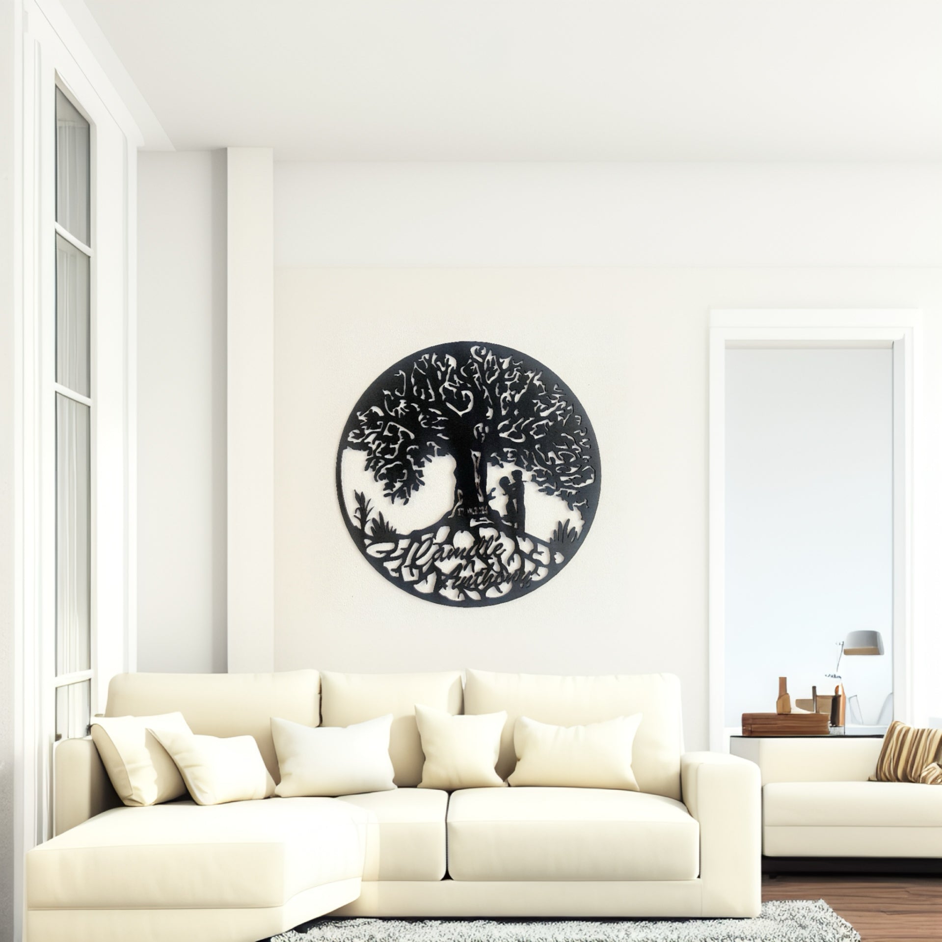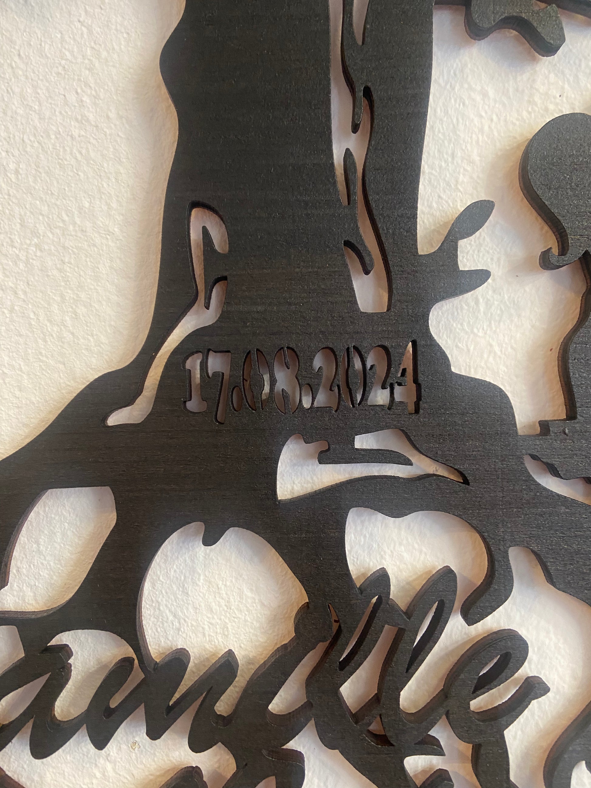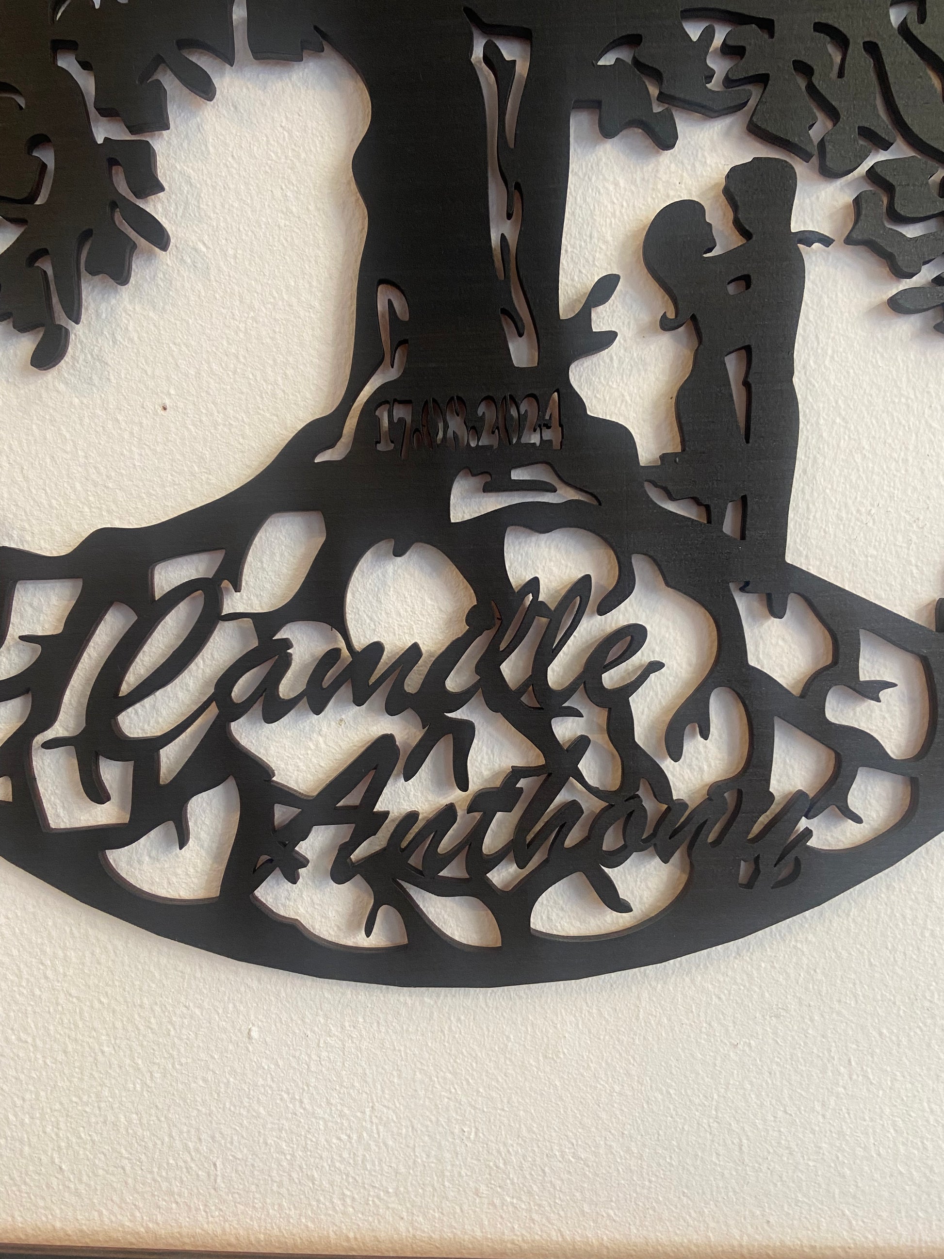 Ce tableau représente un arbre de vie avec un couple sous ses branches. Il est entièrement personnalisable, ce qui en fait un choix idéal pour un cadeau unique. Parfait pour un mariage, il peut inclure la date et les noms des mariés, ajoutant une touche personnelle et mémorable à cette œuvre.