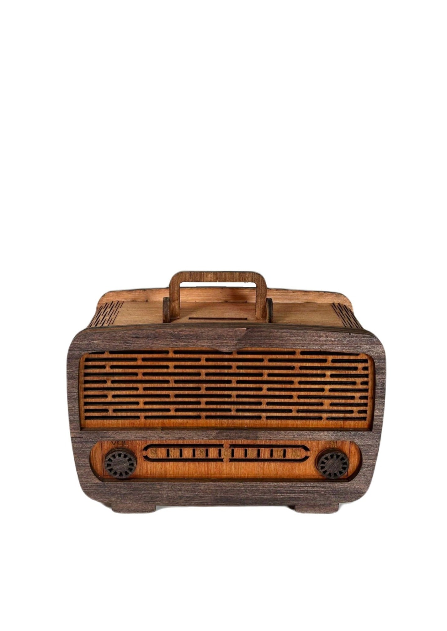Tirelire radio en bois de dimension 20,5 cm de longueur x 8 cm de largeur x 12 cm de hauteur.